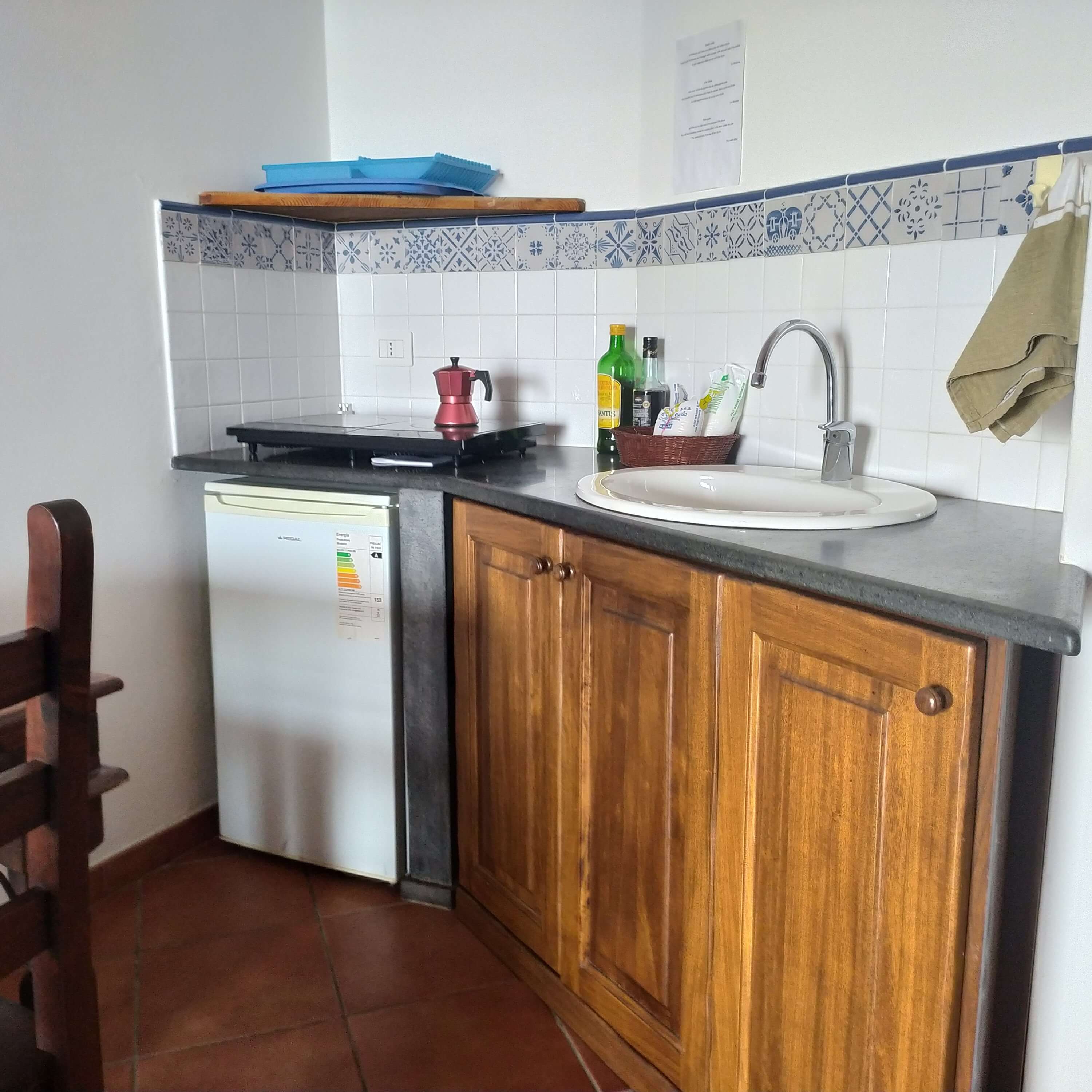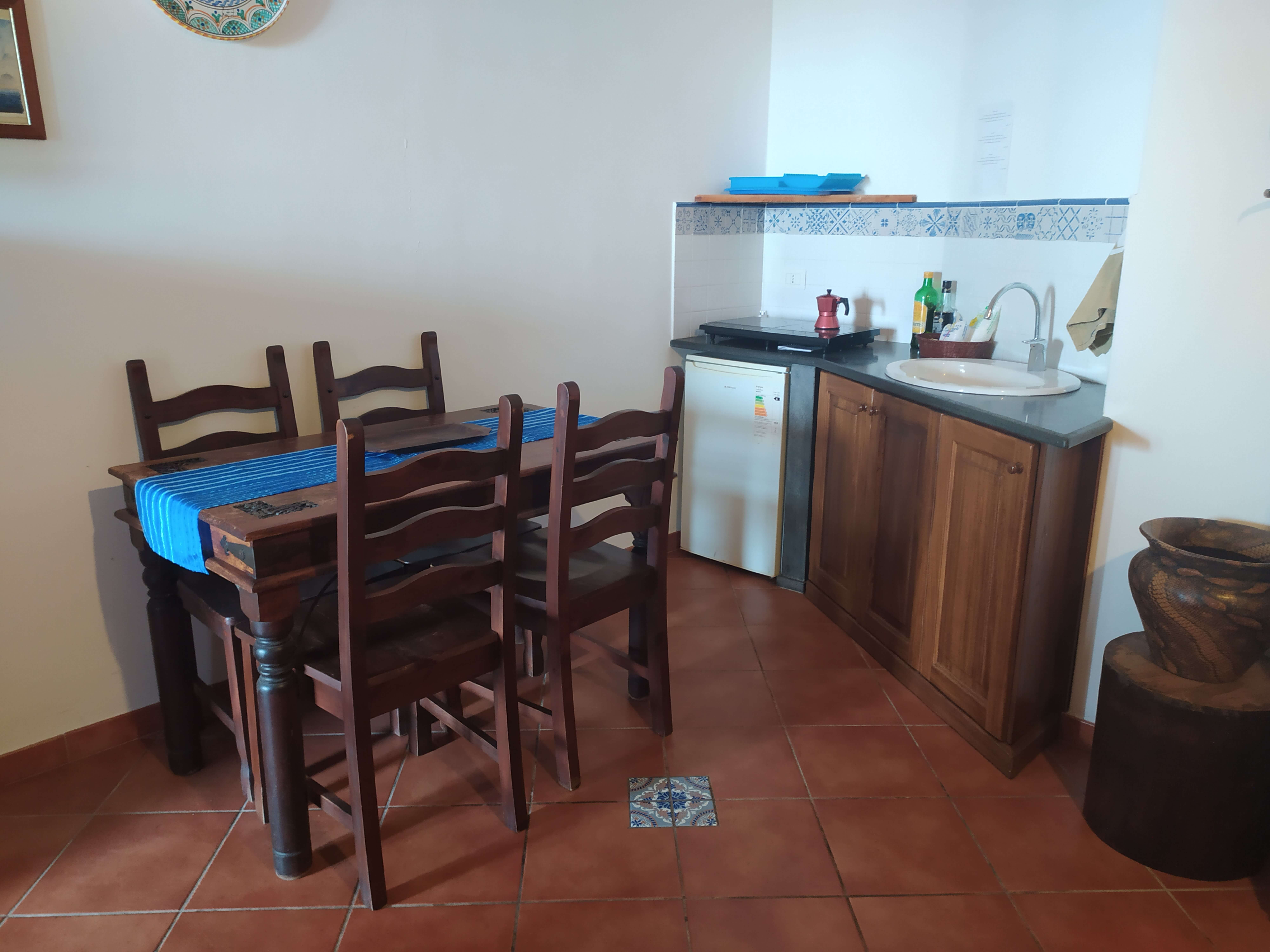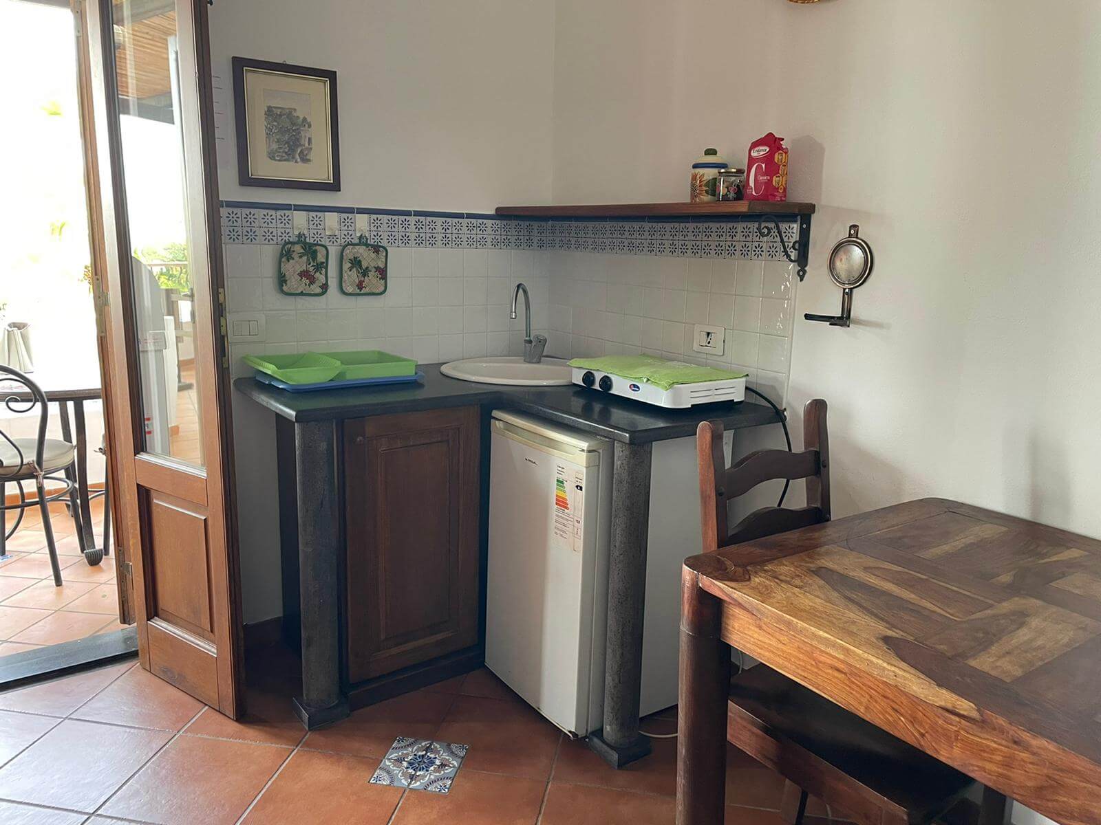 L'angolo cottura è attrezzato con tutto ciò che serve e quest'anno è anche stato dotato di pentole nuove e fornelli a induzione tutti nuovi di zecca. Sempre che tu abbia voglia di cucinare e non preferisca cenare al Ritrovo Ingrid dove, come ospite del Pedra Residence, avrai il 20% di sconto, oppure al Ritrovo Piscità, dove lo sconto è del 10%.