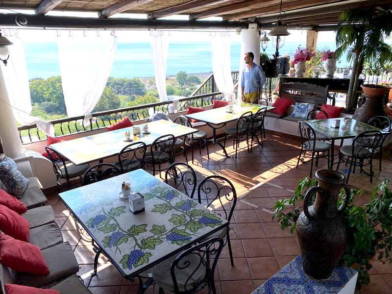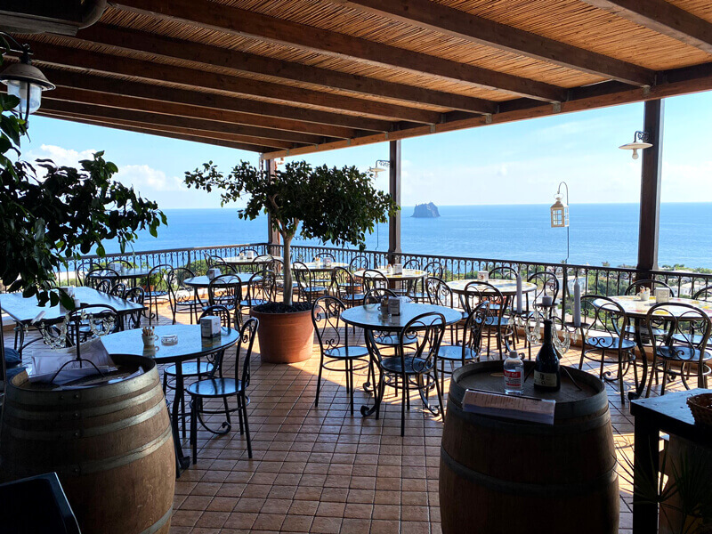 Potrai mangiare quello che preferisci, seduto a un elegante e squisitamente siciliano tavolino in ferro battuto e pietra lavica decorata, con le carezze della brezza che sempre allieta la nostra piazza San Vincenzo, guardando il mare e lo Strombolicchio che ti "sorride" da laggiù, dove il blu è ancora più blu del solito.